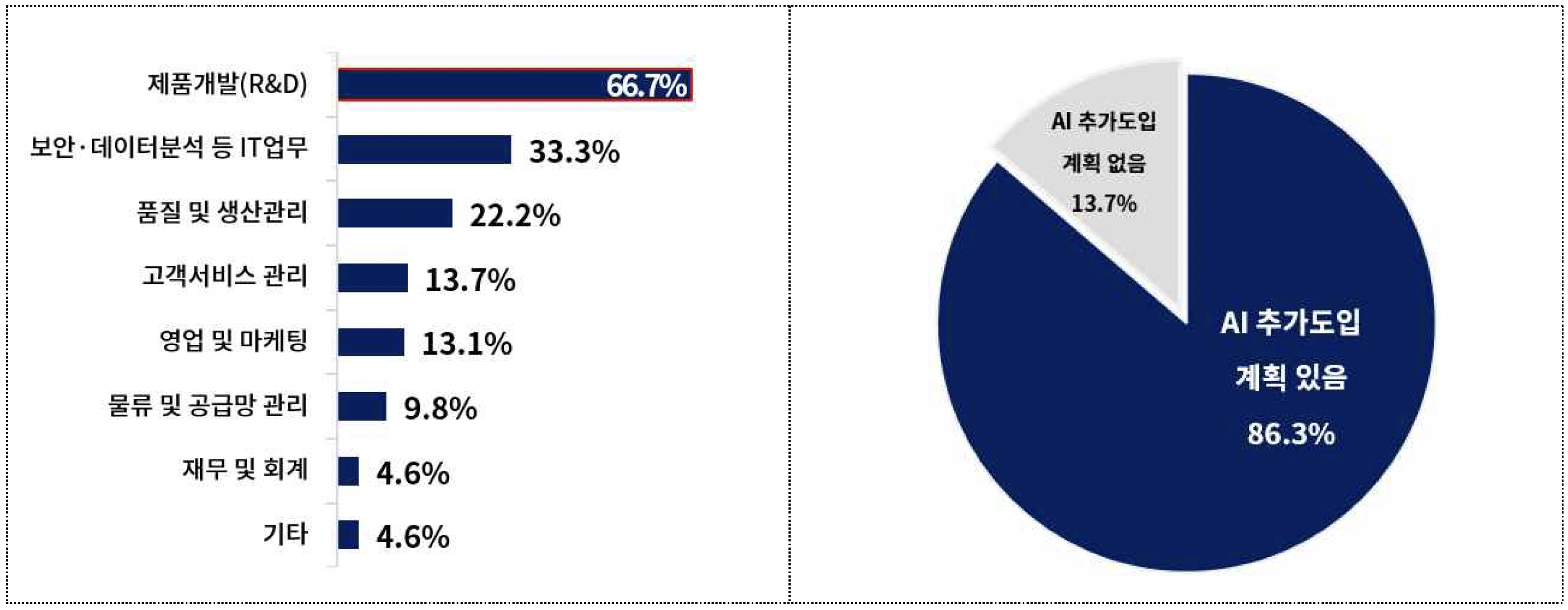 아래의 그림은 2024년도 대한상공회의소에서 발표한 “국내 기업 AI 기술 활용 실태 조사”에 대한 AI기술의 활용도와 관련된 설문조사 결과에 대한 보도자료중 일부입니다.