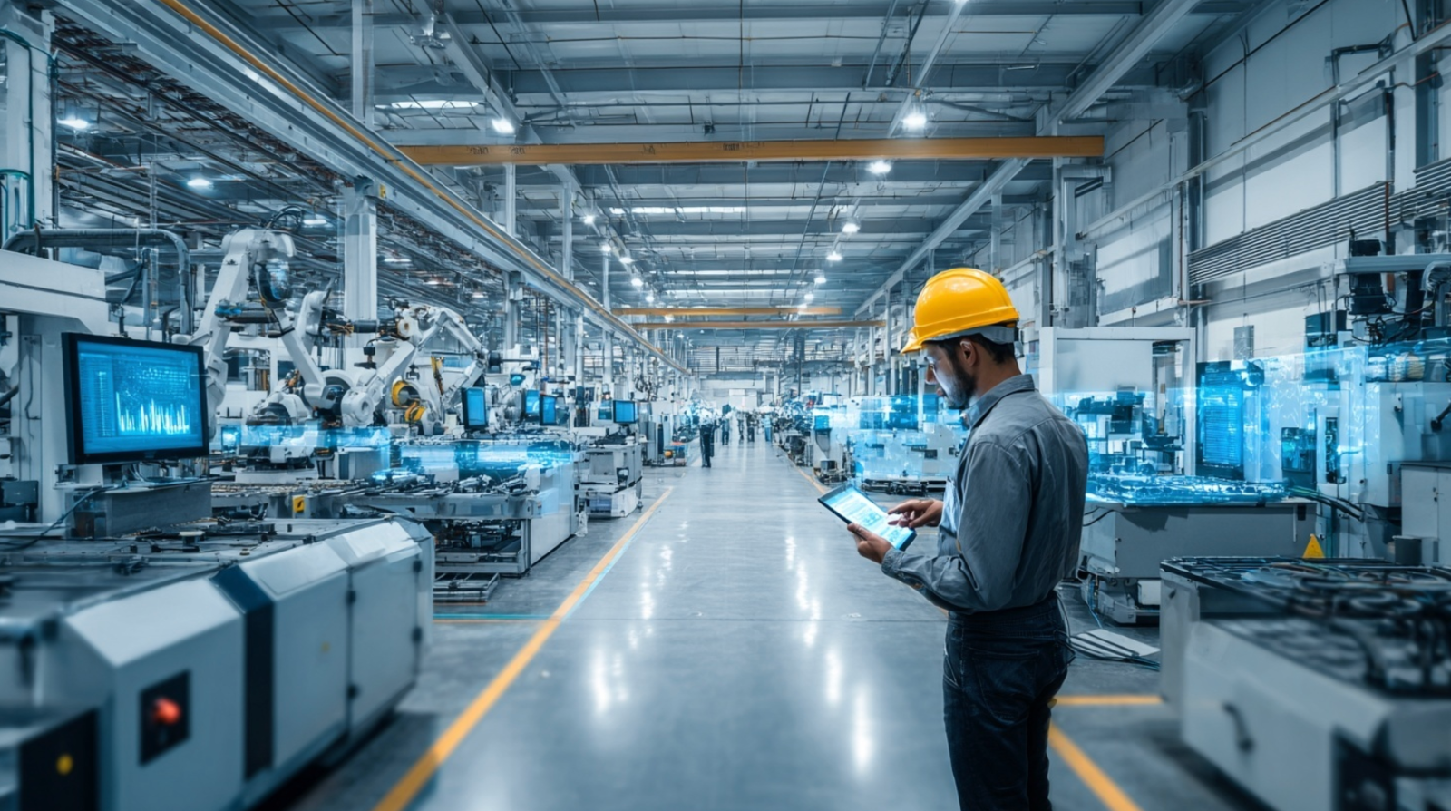 현대적인 스마트 팩토리에서 AI 기반 품질관리 시스템이 운영되는 모습